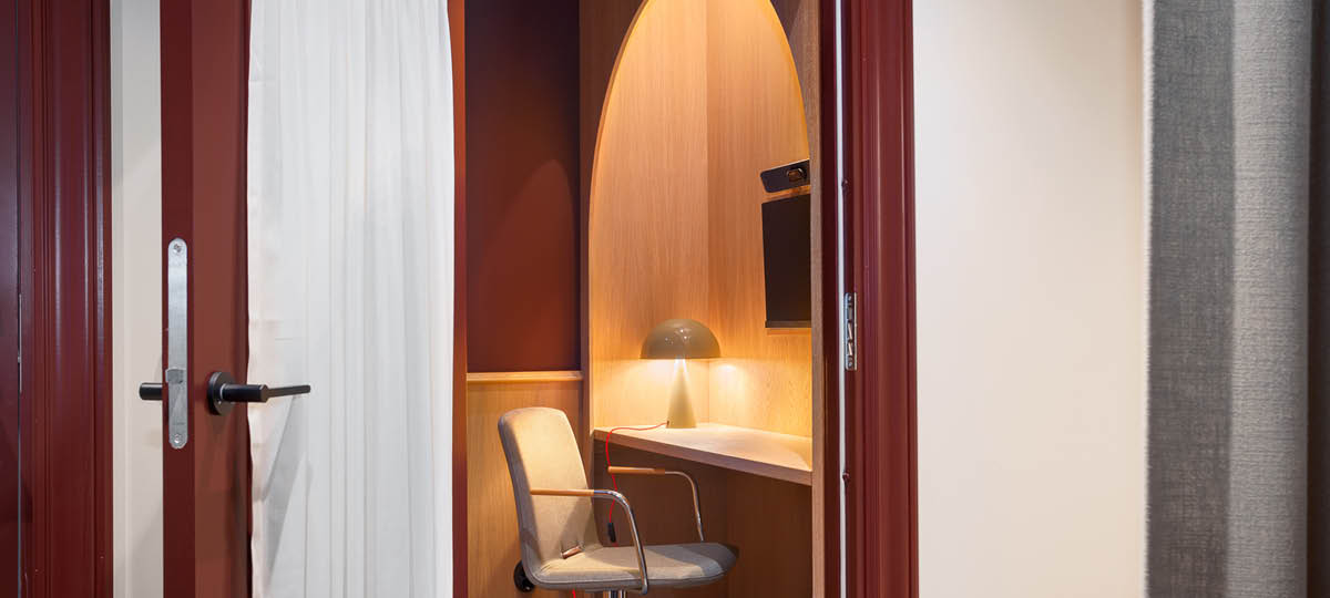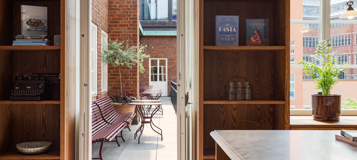 Återbruk har varit en central del i arbetet, där glaspartier och byggnadsdetaljer plockats ned, bearbetats och fått nytt liv i den färdiga interiören.
